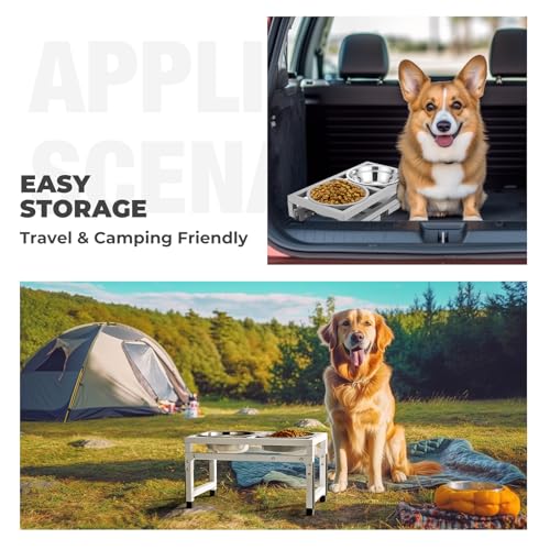 - 4 Hights Adjustable Dog Bowl Stand Grows with Dog. Veehoo dog dishes with stand can be adjusted to 4 different heights: 3.7", 9", 11", and 12.5", accompany your dog from puppy to their golden years. Just push the button and you can adjust the height effortlessly to suit your dog's needs.