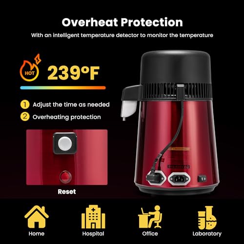 - OVERHEAT PROTECTION - With an intelligent temperature detector to monitor the temperature, when the heating temperature is over 302°F/150℃, the home water distiller will automatically turn off to avoid excessive temperature damage to the machine