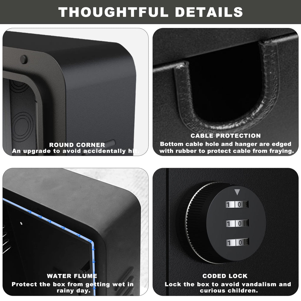 - 【STURDY PROTECTION】The charger box can protect the wall charger from outside weather. Built-in a coded lock to avoid vandalism and theft, also separate the wall charger and animals/curious children.