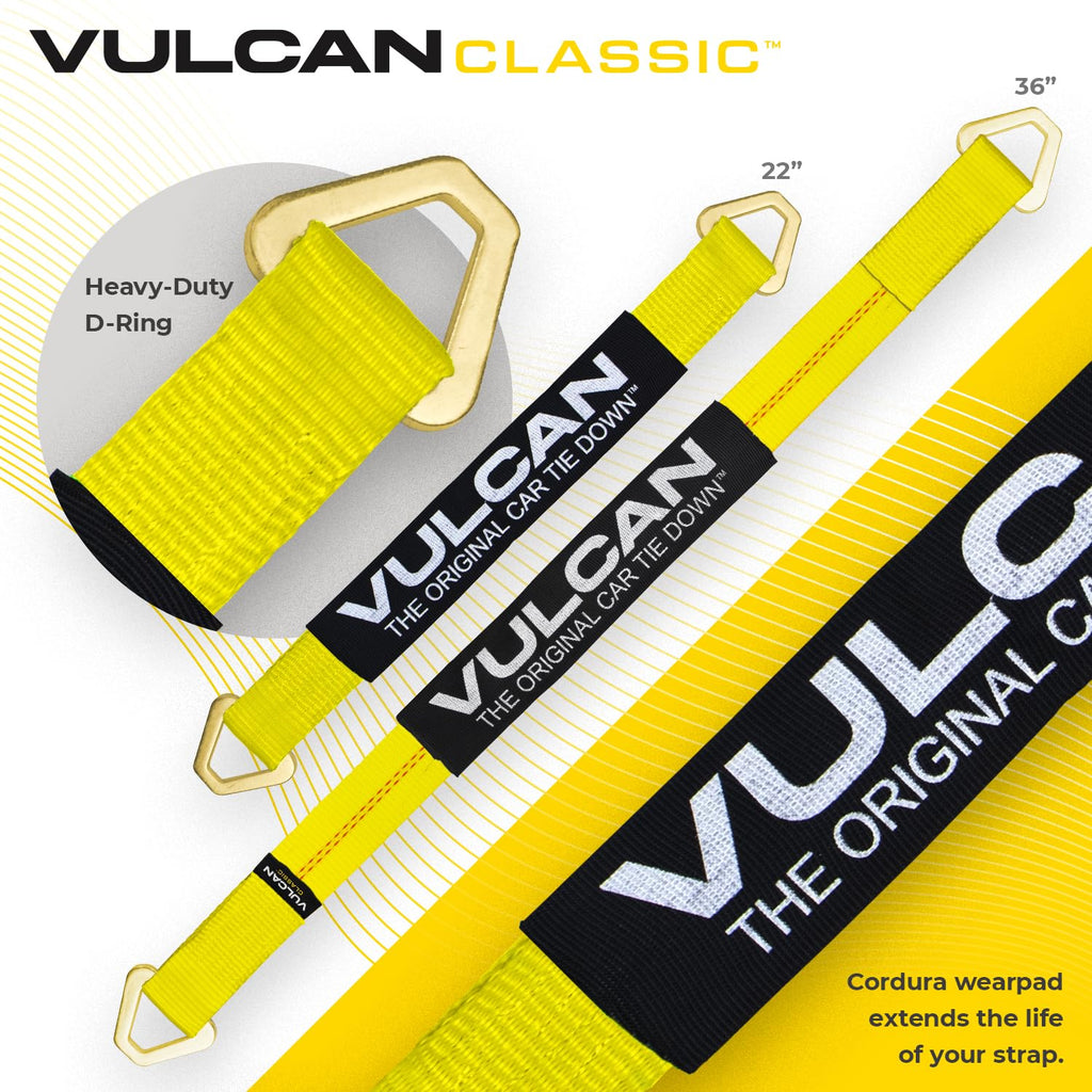 - Heavy-DUTY TIE DOWN WEBBING - Flexible 1-ply 2 inch wide Vulcan Classic Yellow tie down webbing is thick and strong for excellent durability and long service life. Each axle strap includes a full body cordura wear pad for even more abrasion resistance, which provides longer strap life and protects the vehicle from inadvertent scratches. Industrial grade ratchet buckles and end fittings are fully plated to resist the elements and provide dependable service in the field.