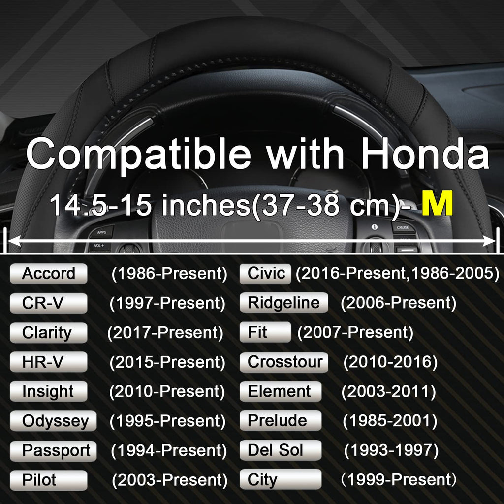 Details: West Llama car steering wheel cover for Honda will fit most Honda vehicle models. This elegant steering wheel cover will give your steering wheel a nice look, and it will protect your steering wheel well. It's an affordable and good option for your steering wheel cover. SPECIFICATION: - Surface Material: Microfiber leather, PVC - Inner Material: Environment-friendly rubber layer - Size: 14.5-15 inches / 37-38 cm - Available colors: Solid Black / Blue+Black / Red+Black - Weight: 550 g/1.2 lbs - COMPATIBLE MODELS: Civic (2000-2005, 2016-Present) CR-V (2000-Present) Accord (2000-Present) Pilot (2003-Present) Fit (2007-Present) Odyssey (2000-Present) Element (2003-Present) Insight (2009-Present) Ridgeline (2006-2014, 2017-Present) INSTALLATION STEPS: Tips: For easy installation, please warm up the steering wheel cover with a hair dryer for a while. Step 1: Line the top of the steering wheel with the cover and cover the top. Step 2: Then pull tight the steering wheel cover from top to side and side to bottom. Step 3: Fix the bottom of steering wheel cover and adjust it.