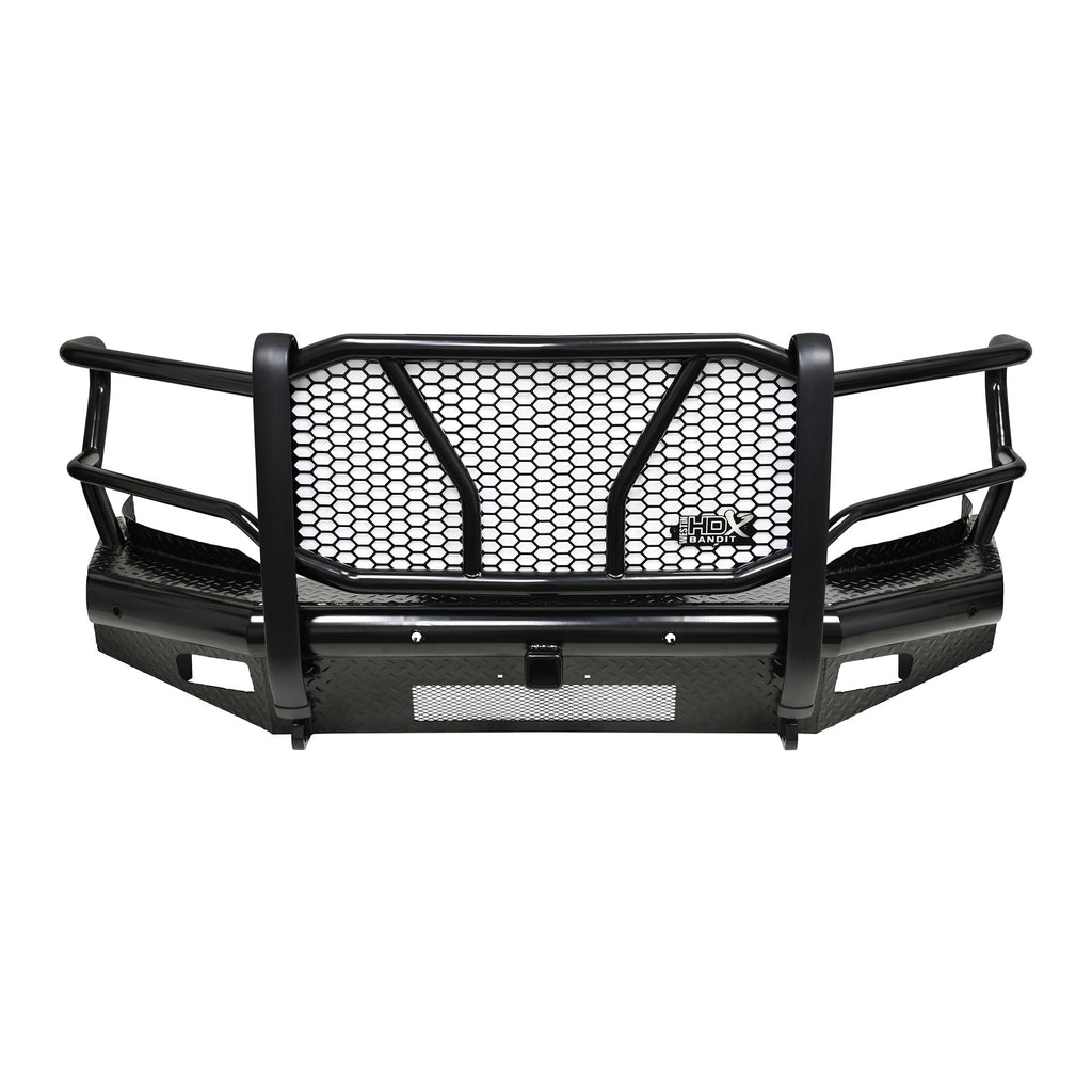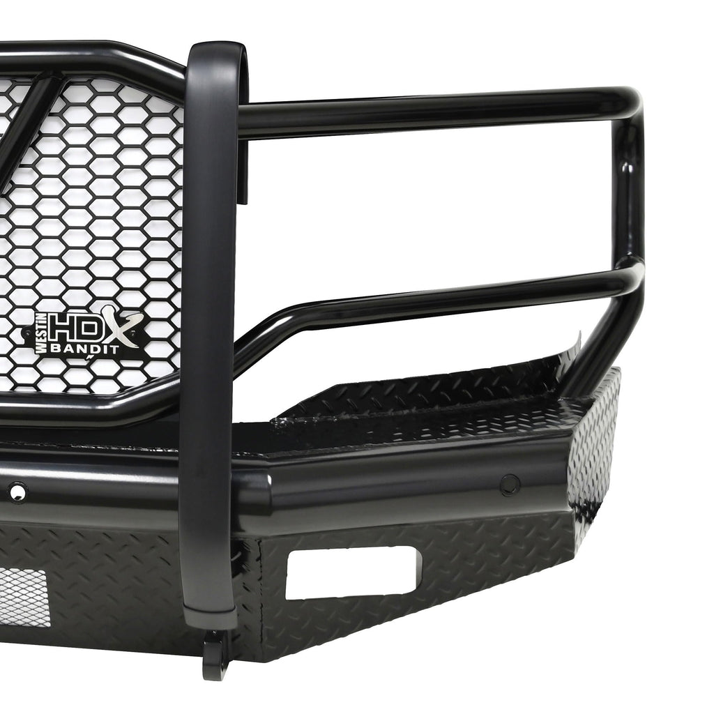 Details: Westins HDX Bandit Bumper combines a heavy duty diamond plate steel bumper constructed of schedule 40 steel pipe with a stylish grille guard featuring 2in. diameter outer wraparound wings and 2 3/4in. wide upright rubber strips. Designed to protect headlights, grille, hood and front fenders from road hazards, debris and wildlife damage. Features a stylish metal honeycomb mesh screen, which allows maximum airflow to the intercooler or radiator area while accenting the front end styling with a clean and rugged look. Removable mesh screens allow for factory camera and adaptive cruise control options available on some late model Ford applications. HDX Bandit Bumper includes a built-in 2in. receiver hitch and (2) heavy duty 9,500 lbs bow shackle mounts, capable of delivering multiple towing options. Compatible for factory fog lamps or LED post mount lights. In addition, some late model Ram and Chevrolet applications feature provisions for factory parking sensors. Bolt-on installation with hardware and mounting brackets included. Available in black powder coat finish.