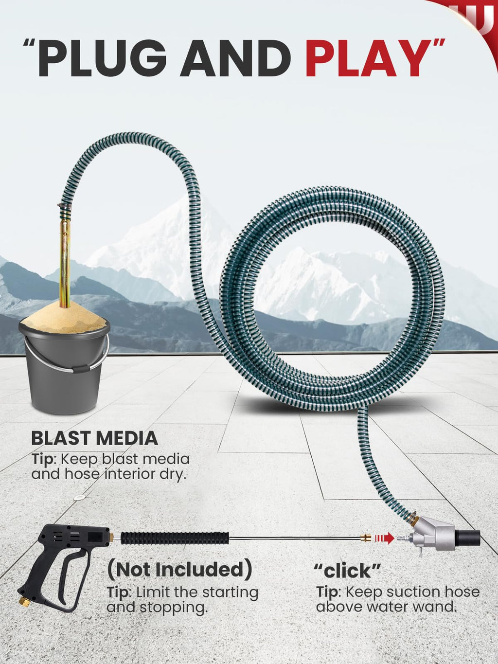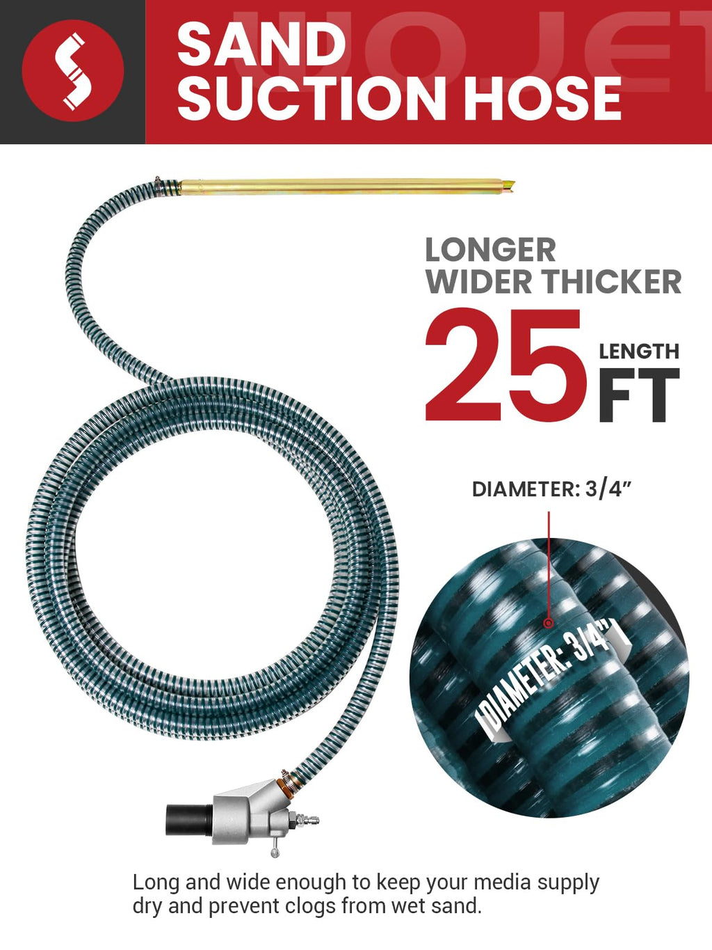 - LONGER HOSE, NO CLOG: Measuring 25 ft in length and with a 3/4" diameter, the hose of the sandblaster kit surpasses common sandblaster kit for pressure washer, offering unparalleled performance. It lets you tackle large projects without repositioning equipment. Ideal for boats, industrial machinery or vehicles. One of the standout features of this sandblaster hose is that it’s long enough to keep sandblasting media dry, minimizing clumping and clogging for a smooth, uninterrupted process