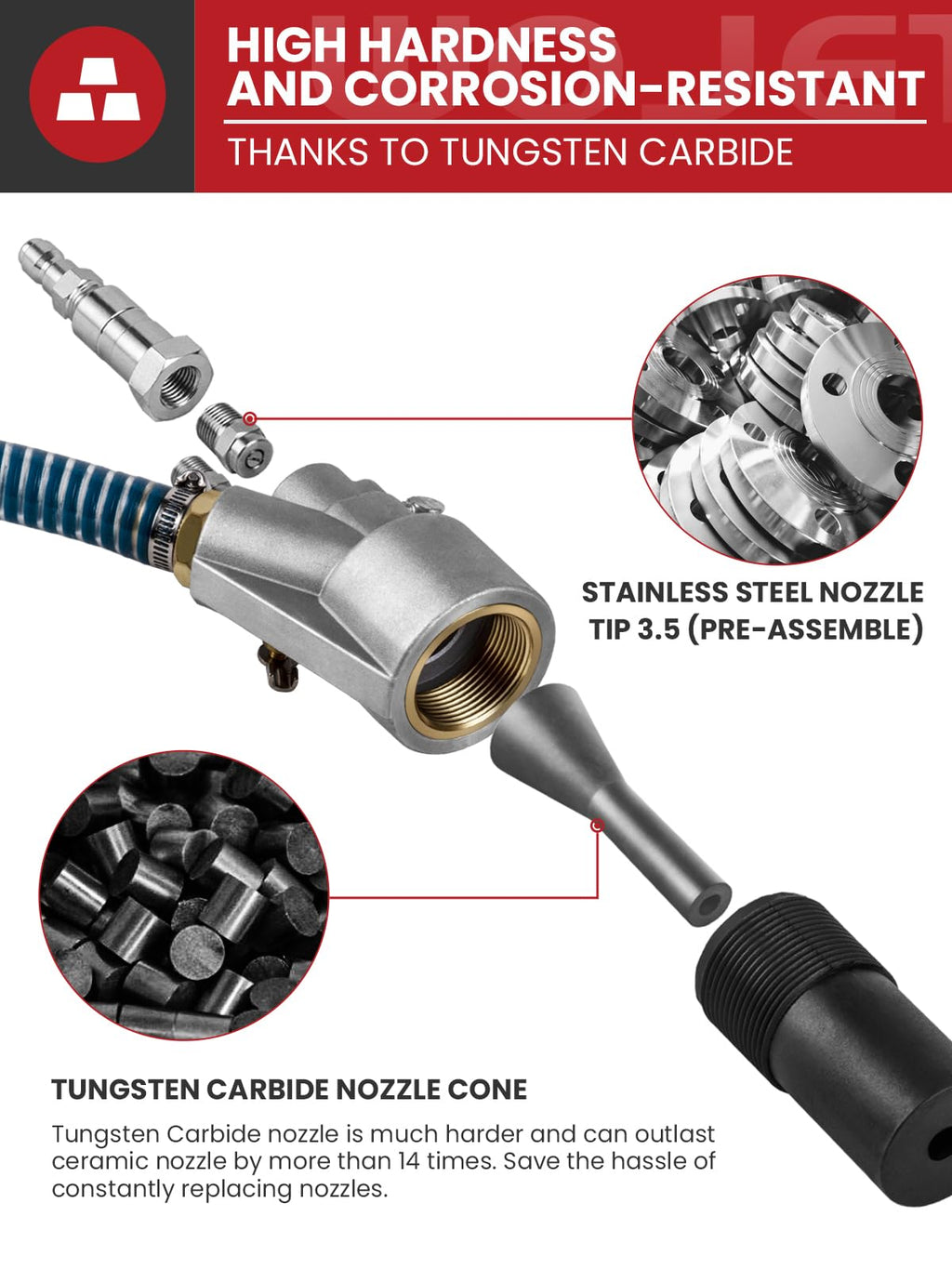 - EXCEPTIONAL LONGEVITY: Upgrade your sandblasting with Wojet pressure washer sandblaster. Featuring a Tungsten Carbide nozzle core that lasts over 14 times longer than ceramic nozzles, it drastically reduces replacements, saving you time. The 304 stainless steel nozzle tip which is pre-assembled inside the sandblaster head resists corrosion and wear, perfect for rigorous tasks. This sand blaster for pressure washer is a must-have tool for any DIY enthusiast, home workshop, or professional