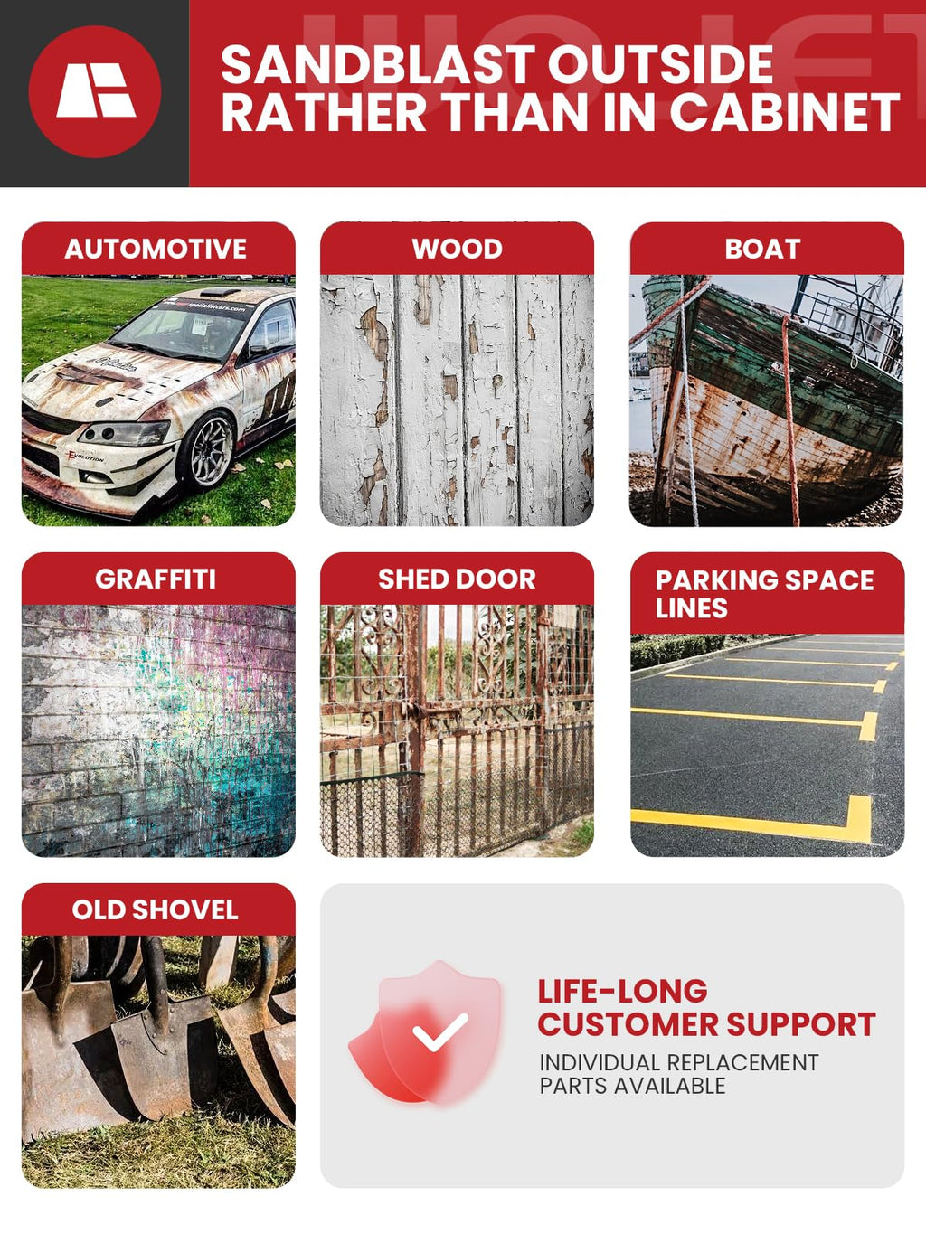 - REDUCE WEAR AND TEAR: Wojet sandblast kit for pressure washer uses a water cooling abrasive media. This method does not warp the metal, ensuring the integrity of the material. It also improves visibility during blasting, allowing for precise control and accuracy. The water reduces dust and friction, creating a cleaner and safer working environment. The WOJET pressure washer sandblasting kit is perfect for cleaning a vehicle's exterior, including the paint and body