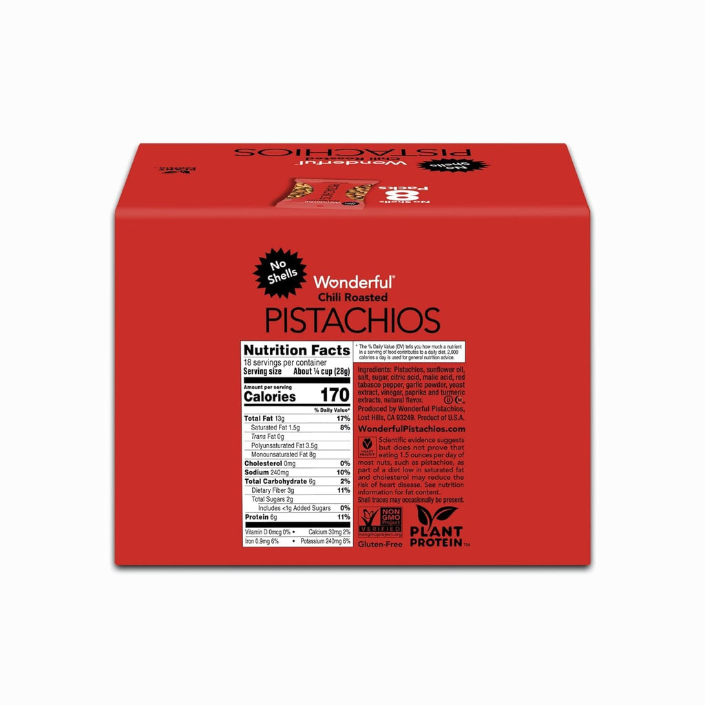 Details: One Box of 8 individually wrapped 2.25 Ounce Bags of our Chili Roasted No Shells Wonderful Pistachios. Wonderful Pistachios have literally come out of their shells. Same delicious taste, but with a little less work for you. Turn up the heat with Chili Roasted Wonderful Pistachios No Shells. They’re bursting with the big, bold flavors of red pepper, garlic and vinegar to tingle your tongue and keep you craving more. Skip the shells and get spicy for Less Crackin’, More Snackin’. Wonderful Pistachios are a smart, healthy choice for folks around the world. Wonderful Pistachios grows all of its pistachios in California’s fertile San Joaquin Valley. The warm days and cool nights work in harmony with the region’s natural soils to create the perfect growing climate. We then carefully tend and harvest each pistachio using the latest in sustainable practices. Nutritious and healthy pistachios are great as part of an overall healthy diet. Pistachios are also a good source of plant protein. And in addition to tasting great, a single serving includes about 49 pistachios, enough to satisfy your snacking needs. Note: Contains Tree Nuts (pistachios).