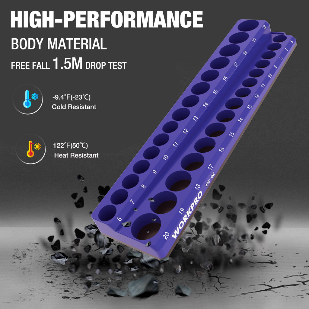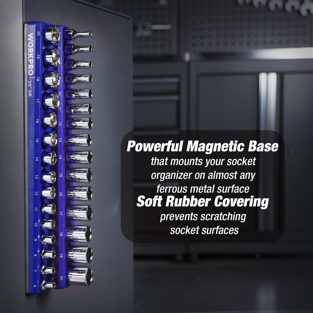 - Well Organized: The 3/8" drive magnetic socket organizer safely stores deep and standard metric sockets, keeping them well-organized. Its magnetic base features a soft rubber surface to prevent scratching and can be mounted in a tool drawer or on the side of your toolbox for easy access