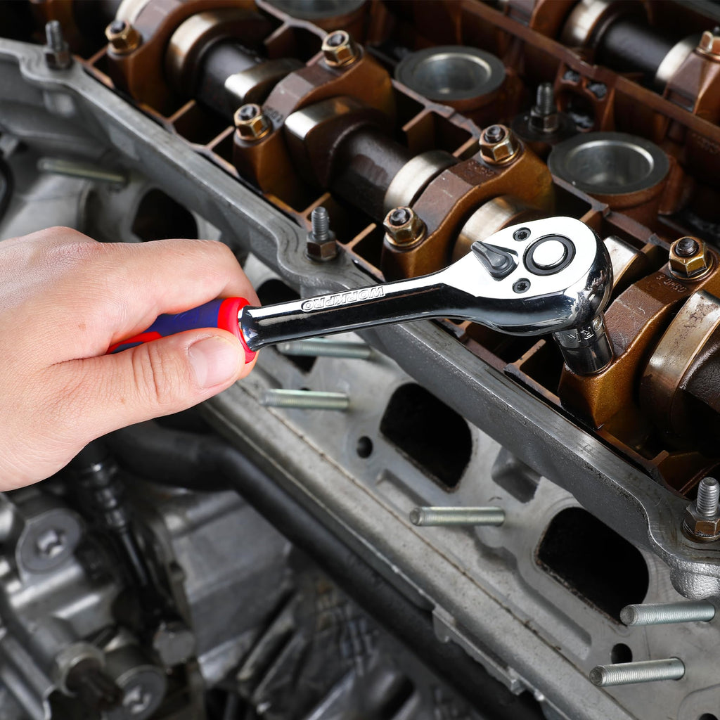 - Reversible Ratchet: The reversible 72-tooth ratcheting mechanism only needs a five-degree swing arc to operate and the drive direction can easily be changed with a flick of the thumb switch on the back of the ratchet head. The quick-release feature of the ratchet wrench makes switching between sockets a breeze