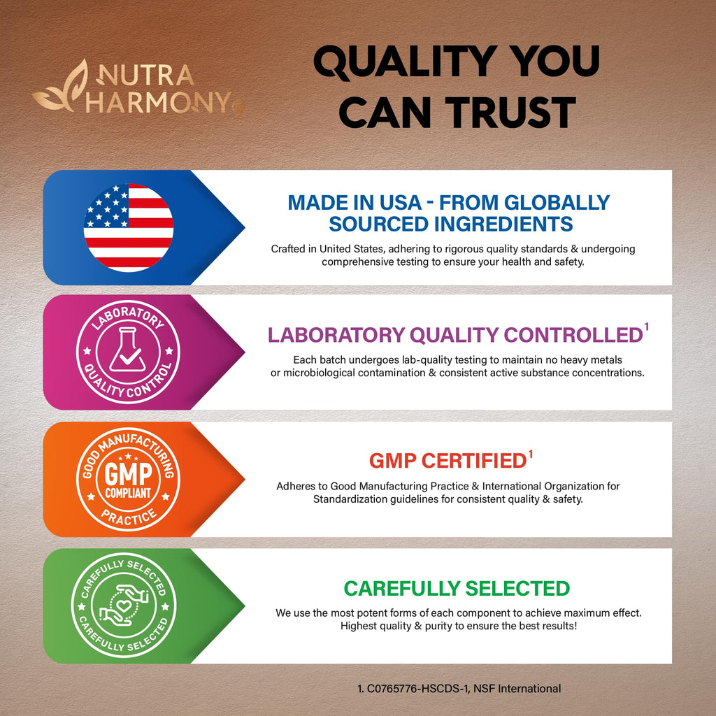 - TRUSTWORTHY SERVICE — at NUTRAHARMONY, we’re dedicated to your wellness journey. From premium ingredients to precise manufacturing, we provide supplements you can trust, and customer care that’s always here to support you.