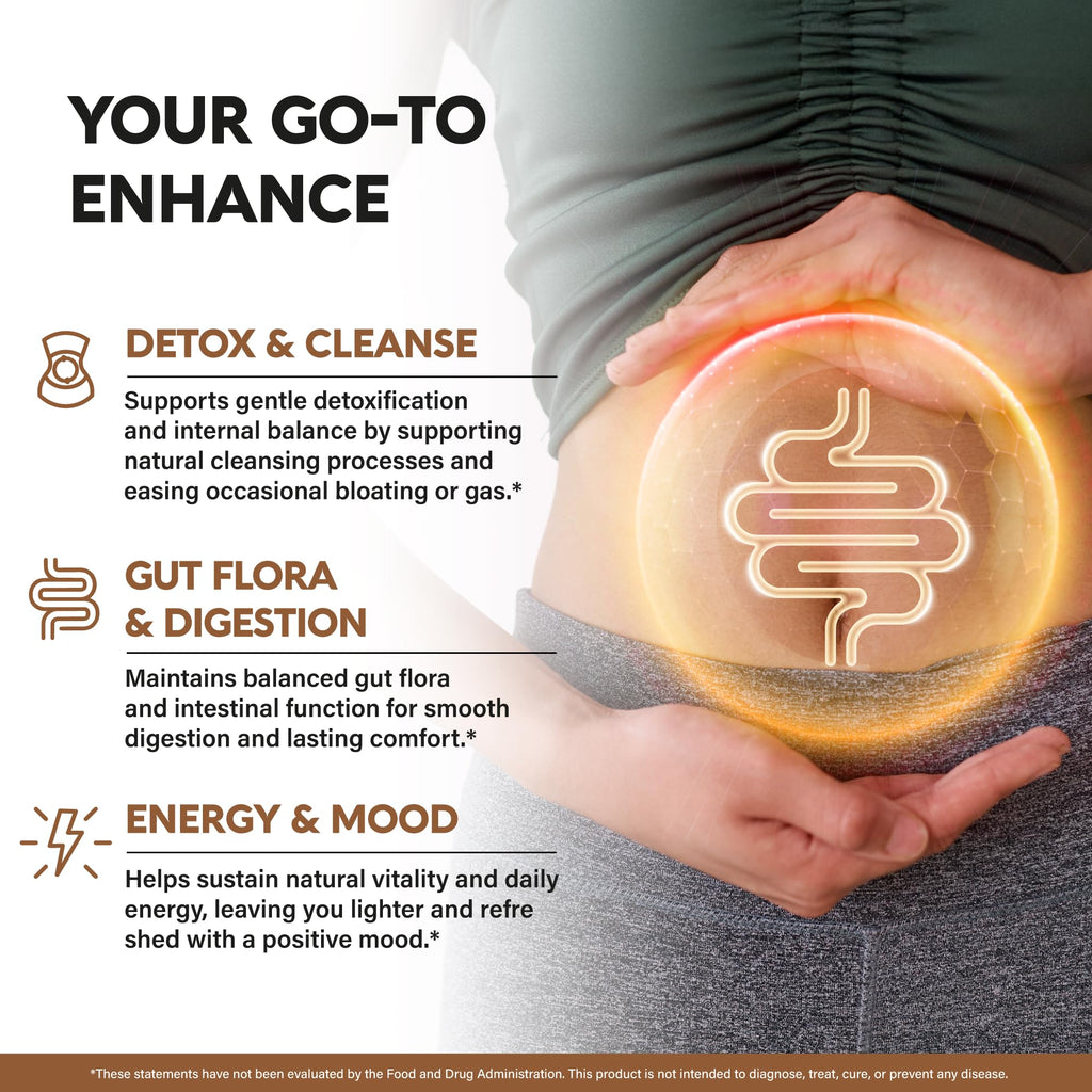 - HEALTHY GUT & DIGESTION — gently supports detox and internal balance, easing occasional bloating or discomfort. Supports balanced gut flora and smooth digestion, leaving you feeling lighter, energized, and in a naturally positive mood all day long.