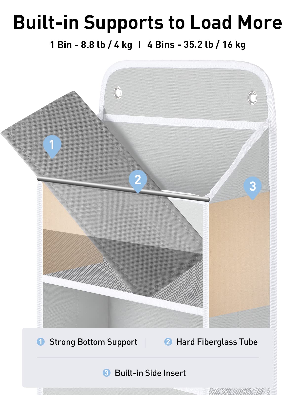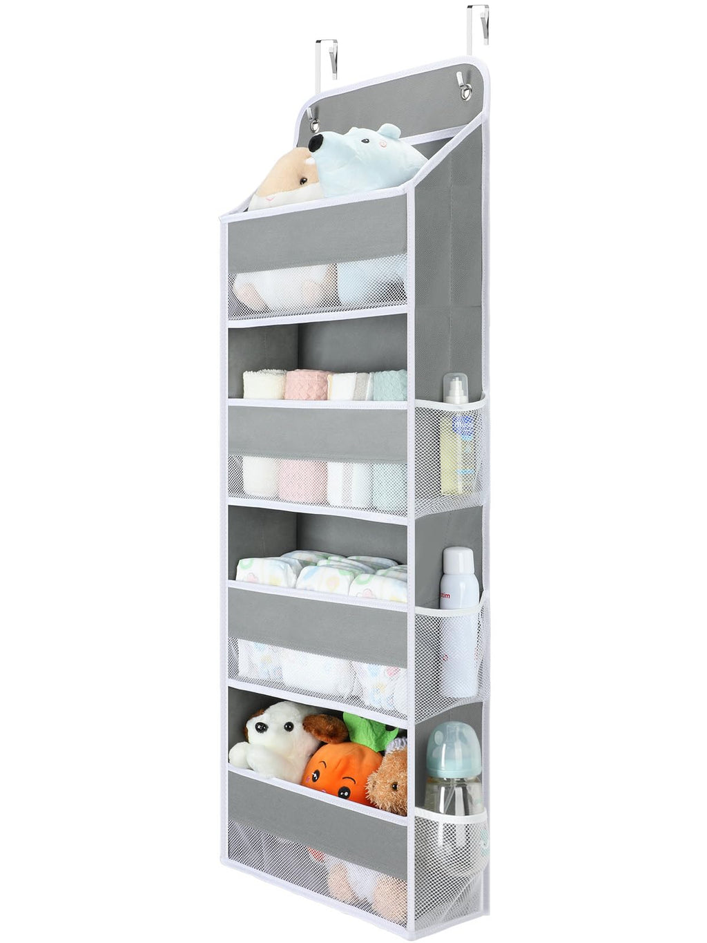 - 4 + 6 Large Capacity for Storage: The over door organizer hanging which is 42.52in x 13.78in x 5.5 in (H x L x W), boasts 6 mesh side pockets and 4-tier spacious storage bins. Each bin has a see-through mesh window for easy accessibility. The spacing between each tier, now increased to 4.33 inches, helps you accommodate different-sized items like wipes, toilet paper, snacks, and more daily necessities and baby items like newborn diapers. Meantime, side pockets are perfect to hold small items for tiny home.