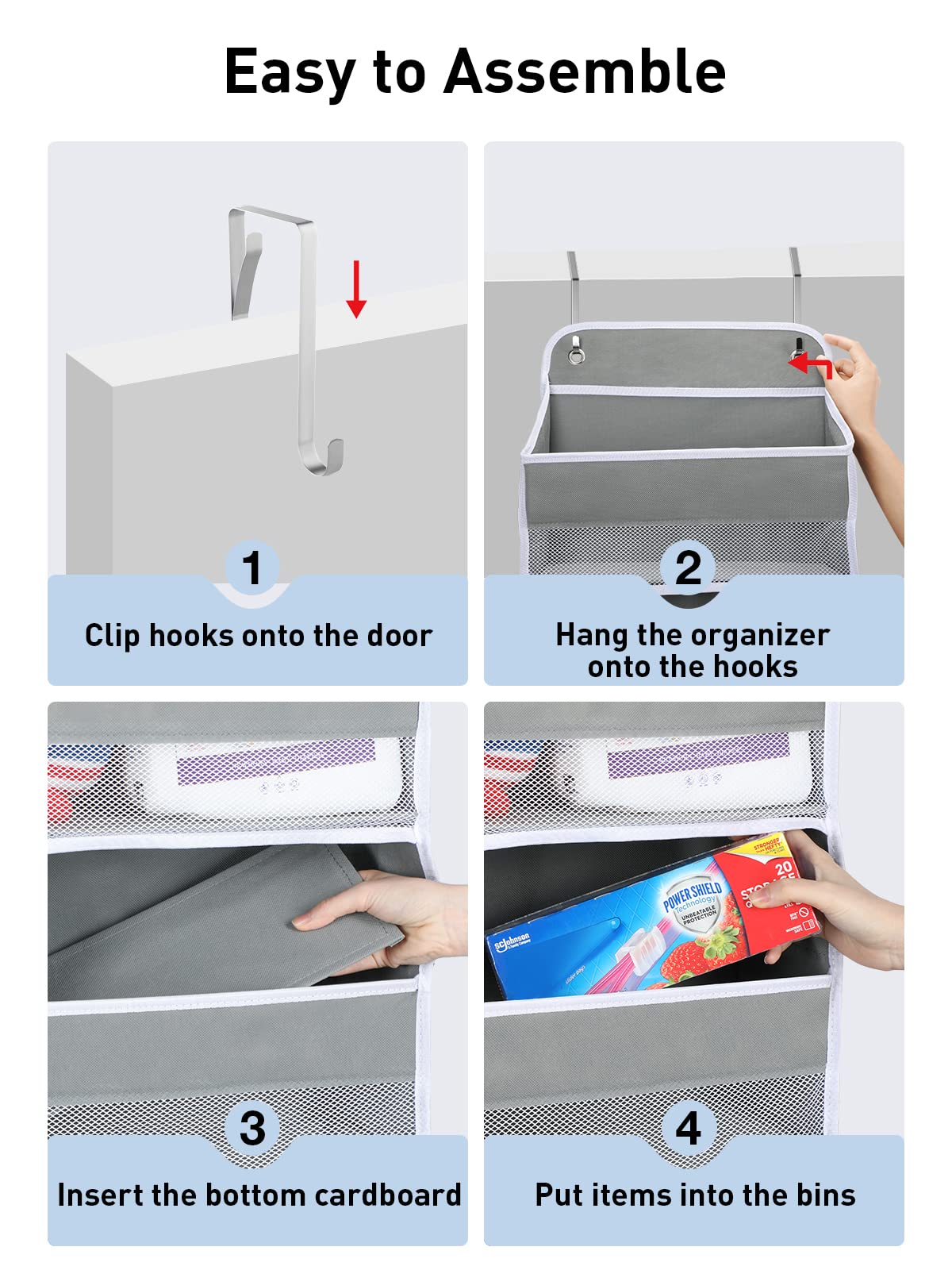 - Easy to Assemble: Afraid of tricky assembly? Don't worry. Our bathroom storage and organization can be assembled in no time at all, simply hang the hook on the door, hang the organizer onto the hooks, and inser the 4 bottom cardboards. Then, you can start your storage journey to match room decor. Additionally, our special clip-on hooks add more flexibility, making the back of baby boy essentials a universally fit solution for doors less than 1.65" thick.