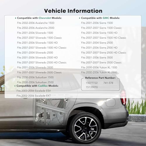 - Perfect Fitment-2: Our Window Regulator and Motor Assembly is Designed to Compatible With GMC Models: Sierra 1500/1500 HD/2500 HD/3500 2001-2006, Sierra 1500 Classic/1500 HD Classic/2500 HD Classic/3500 Classic 2007, Sierra 2500 2001-2004, Yukon XL 1500/2500 2000-2006; Compatible With Cadillac Models: Escalade ESV 2003-2006, Escalade EXT 2002-2006