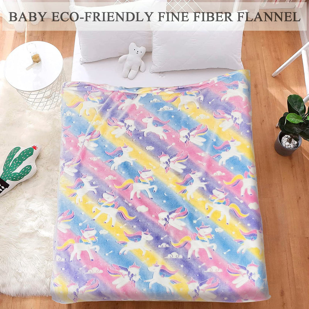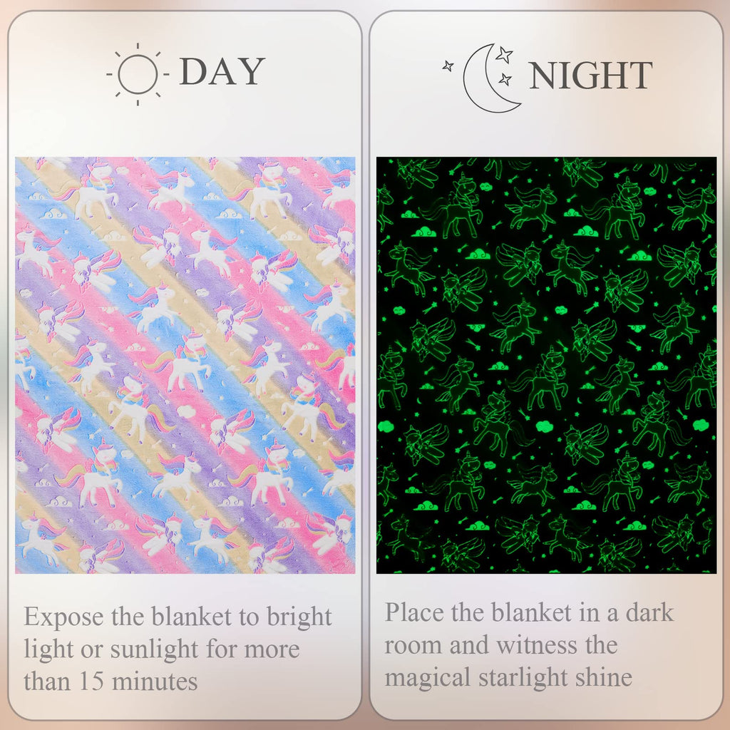 - 【Glow In The Dark】Gifts for 5 year old girl.The unique design of the baby blankets for girls is that it can glow in the dark, which is fun and mysterious. Just expose the girls blanket to a bright light source or sunlight for about 15 minutes. The brighter the light, the more luminous the unicorn blanket will be in the dark.
