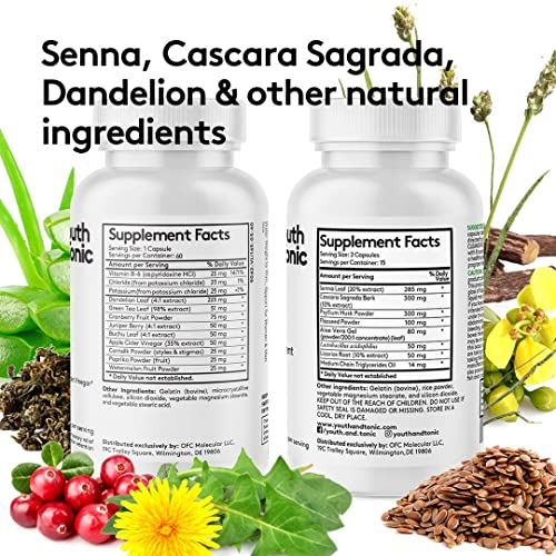 - [ WHAT’S IN IT ]: Great natural formulation with Dandelion Corn Silk Juniper Cranberry & Green Tea | Powerful blend of natural Senna leaf & Cascara Sagrada | Soluble fibres – Psyllium Husk & Flaxseed | Herbs - Aloe Vera & Licorice Root | 50 mg probiotic L. acidophilus