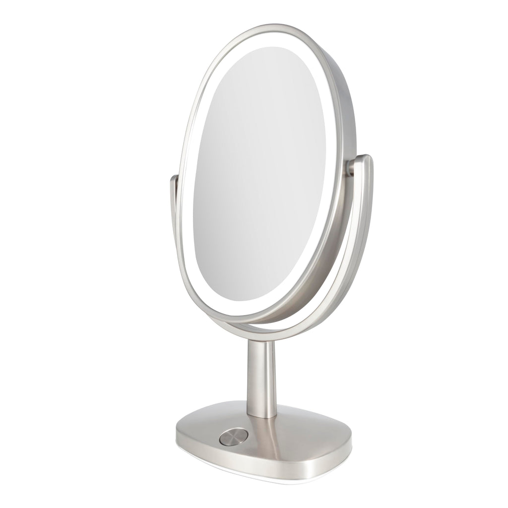 - Dual-Sided Mirror: Features a 10" wide by 18" tall oval LED lighted makeup mirror with 1x magnification on one side and 5x magnification on the other
