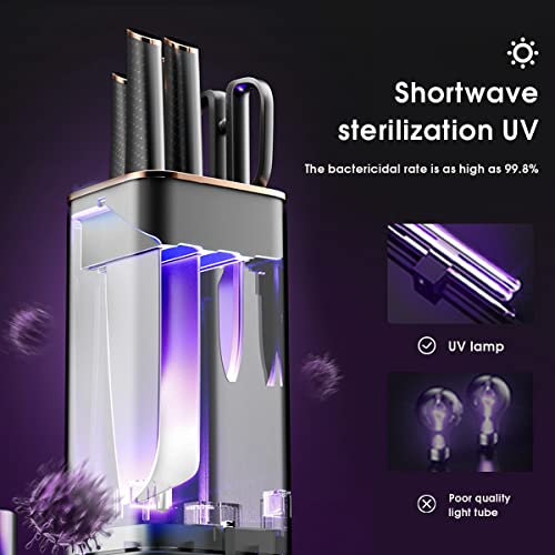 - Smart Cleaning: The interior of the knife holder has a cleaning and drying function, waterproof and rust-proof. Wash the knife and put it back on the knife holder and press the button, the base will turn on breathing light and start working. The light goes off after five minutes, after fifteen minutes the cleaning job is over. The knives will become clean and dry.