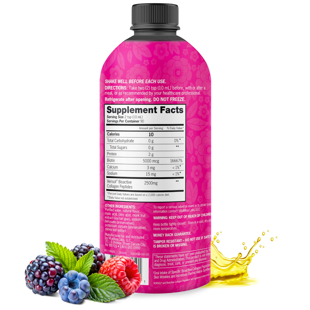 - Delicious Mixed Berry Supplement: You can pass on bland collagen powders. Our liquid collagen and biotin supplement is mixed berry flavored, providing a delicious flavor that tastes great on its own or when mixed with a smoothie, juice, or water