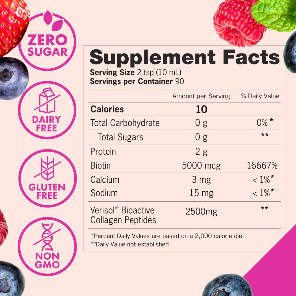 - Support Your Hair, Skin, and Nails: Our liquid collagen is packed with 5000mcg of biotin and 2500 mg of Verisol Bioactive Collagen Peptides, helping support more elastic and radiant skin (1), thicker hair, and stronger nails