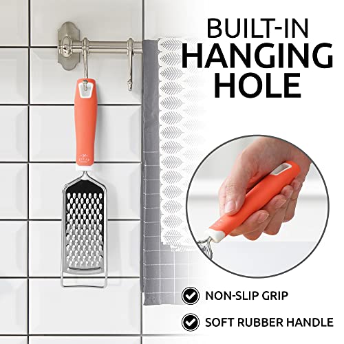 - PREMIUM QUALITY, VERSATILE GRATER: Made with high-quality 18/10 rust-resistant stainless steel, this cheese grater has a strong and sturdy frame that can handle pressure without getting bent. Apart from cheese, this small grater can be used for ginger, garlic, nutmeg, chocolate, citrus fruits, butter, and vegetables like carrots, potatoes, zucchini, and more.