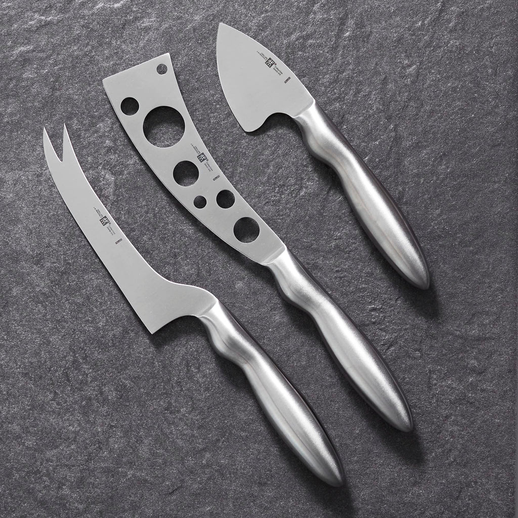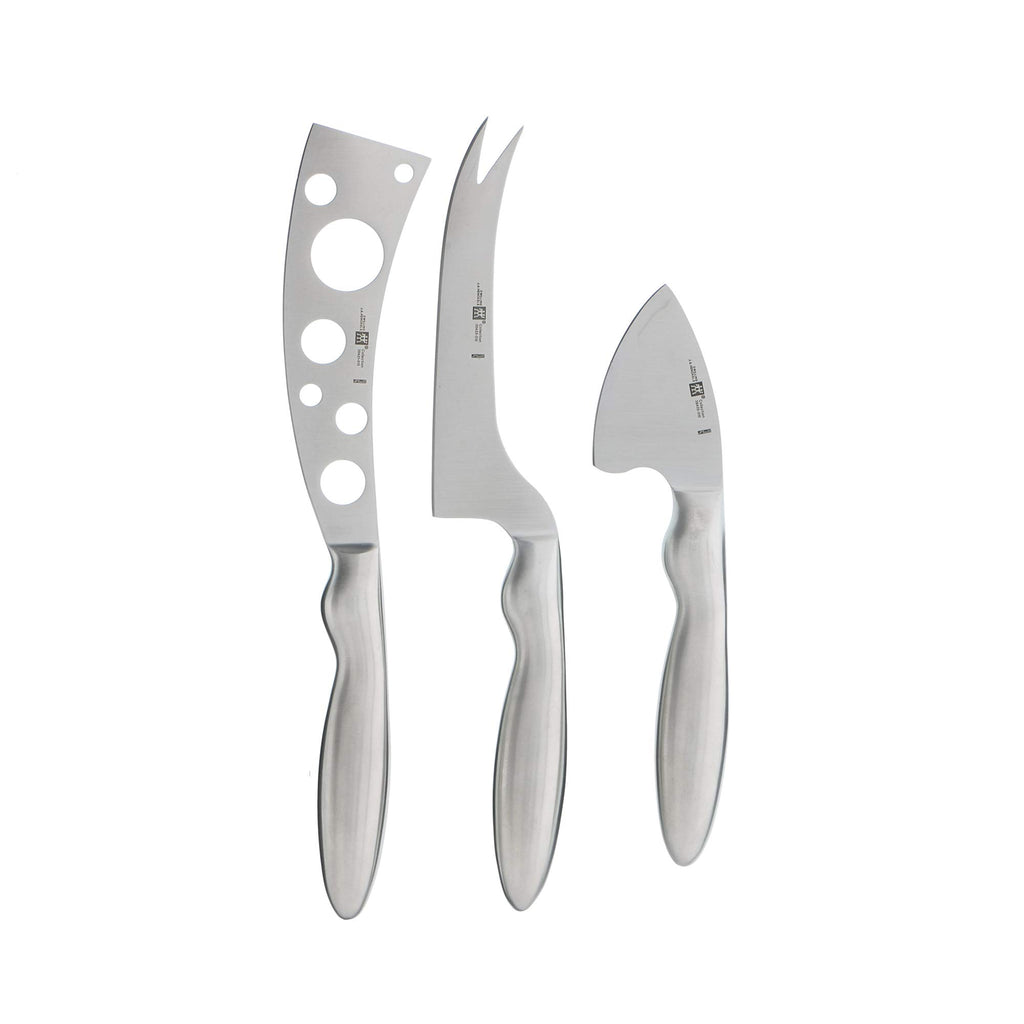 Details: Set of 3 cheese knives accommodates multiple types of cheese.-Inch knife with forked tip and 5-1/2-inch perforated knife for semi-hard cheeses. Made of high-quality stainless steel for long-lasting beauty and performance.