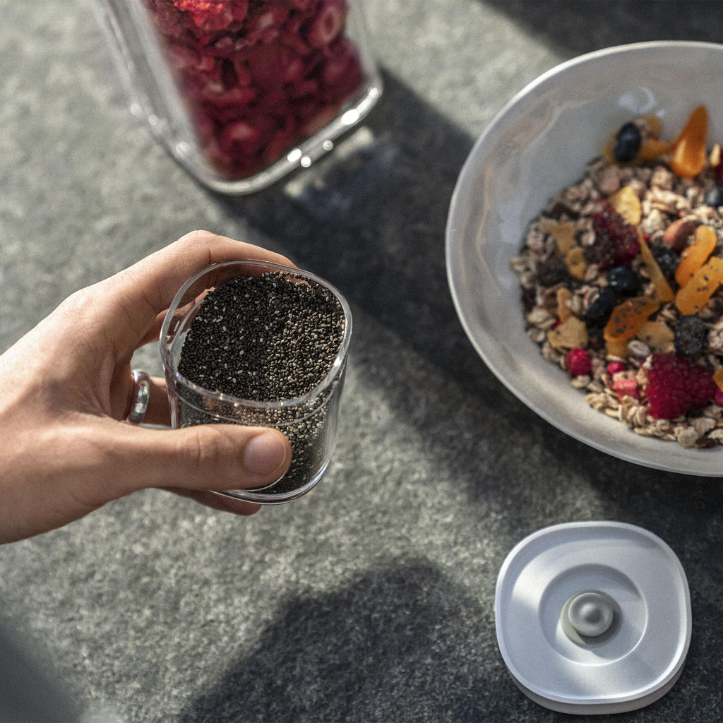 Details: The stylish, space-saving solution to dry food storage.Personalize your kitchen while saving space and reducing waste with the Fresh & Save CUBE food storage system. The sleek, modular design features straight walls and non-slip bottoms for secure, space-saving stackability. Constructed with expert German engineering, the glass-like, BPA-free material is extremely durable and scratch-resistant for a high-quality, balanced feel.The nine different sizes fit every kitchen. Available in four lid sizes, spice container (XS), small square (S), slim rectangle (M), and large square (L), you can mix and match sizes and heights to fit your space. Store nuts for a healthy snack in the small S containers while the taller ones are perfect for dry pasta, crackers, or granola. Maintain cereal’s crunch in the tall 3M container to start your mornings off right. Keep homemade cookies soft in the ample L size.Neatly store the versatile CUBE in your pantry and drawers. Show them off on your countertop to keep ingredients within reach with airtight storage. Tight-fitting lids lock in freshness to maximize flavor and minimize food waste. With the Fresh & Save vacuum pump, you can seal ingredients, then tuck them away in your pantry while keeping them fresh when not in use for extended periods of time.