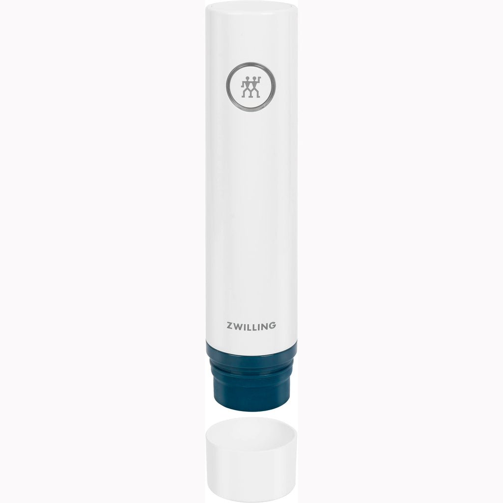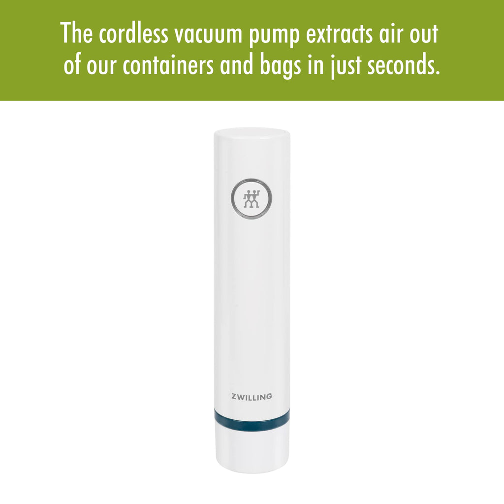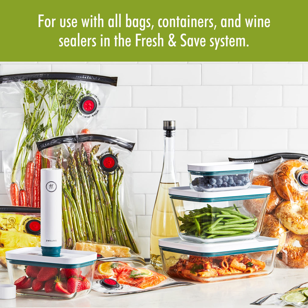 Details: The Fresh & Save La Mer vacuum pump is at the heart of the smart storage system by ZWILLING. Featuring a beautiful sea-inspired design, the sleek, quiet vacuum pump extracts the air out of our vacuum containers and bags in just seconds and preserves aromas and vitamins. It stops automatically once a sufficient vacuum has been created. The La Mer vacuum pump can be charged using the included USB cord. With the Fresh & Save system, you can shop once a week and refrigerate or freeze fresh fruit, vegetables, meat, and fish in our vacuum containers and bags and enjoy the benefits of your own fresh market at home. Prepare your meals days in advance and enjoy them as fresh as the day they were cooked. Cook meat sous vide or marinate meat for the grill in just 30 minutes in the vacuum bags and containers. Here’s how it works: Dock the vacuum pump onto the container or bag valve and at the push of a button it extracts the air in mere seconds. It stops automatically once a sufficient vacuum has been obtained, locking in flavor, aromas, and vitamins.