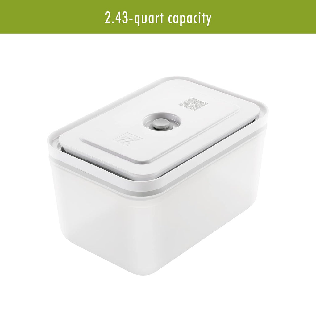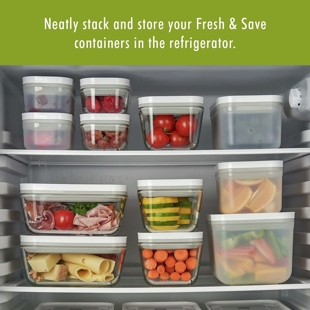 Details: Eat healthier, save time, and store your food with long-lasting freshness with the new vacuum storage system: Fresh & Save. The exclusive Fresh & Save technology preserves flavors and nutrients, prevents freezer burn, and keeps food fresh up to five times longer than non-vacuum storage methods. Blending the power of a countertop vacuum sealer with the versatility of a handheld device, the cordless vacuum pump is fast, quiet, and easy to use. And thanks to its compact design, it will fit into any kitchen. We currently offer two starter sets available with vacuum pump, reusable BPA-free bags that are easy to close with a zipper attachment and are ideal for sous-vide cooking and microwave reheating, and either borosilicate glass or BPA-free polypropylene plastic containers. With the ZWILLING double sealing effect (most others only seal one surface) the containers shut tightly for super-fresh food. What’s more? The downloadable Culinary World app will track when you store food and when it will spoil, helping you to reduce food waste and save money. For a smart way to store food, choose Fresh & Save.