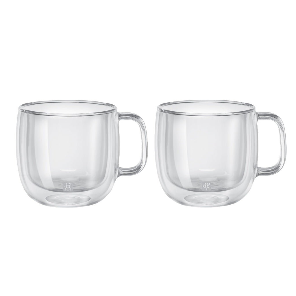 Details: Elevate your morning coffee break with these elegant cappuccino glasses. These wide-mouthed glasses are ideal for serving cappuccinos topped with velvety milk foam. And cold drinks, such as iced lattes, stay chilled without leaving messy condensation rings on the table. These glass mugs are truly as beautiful as they are functional. Mouth-blown by skilled artisans, this distinctive glassware offers a visually impressive way to serve your favorite beverage. The innovative double-wall design maintains your beverage's ideal temperature, without messy condensation or the need for a coaster. Each Sorrento Plus glass features an ergonomic handle that fits comfortably in hand. Exceptionally durable due to their high-quality, sturdy borosilicate glass construction, these glasses are both dishwasher safe and lightweight, making them a perfect option for outdoor dining. Set includes 2 cappuccino glasses.