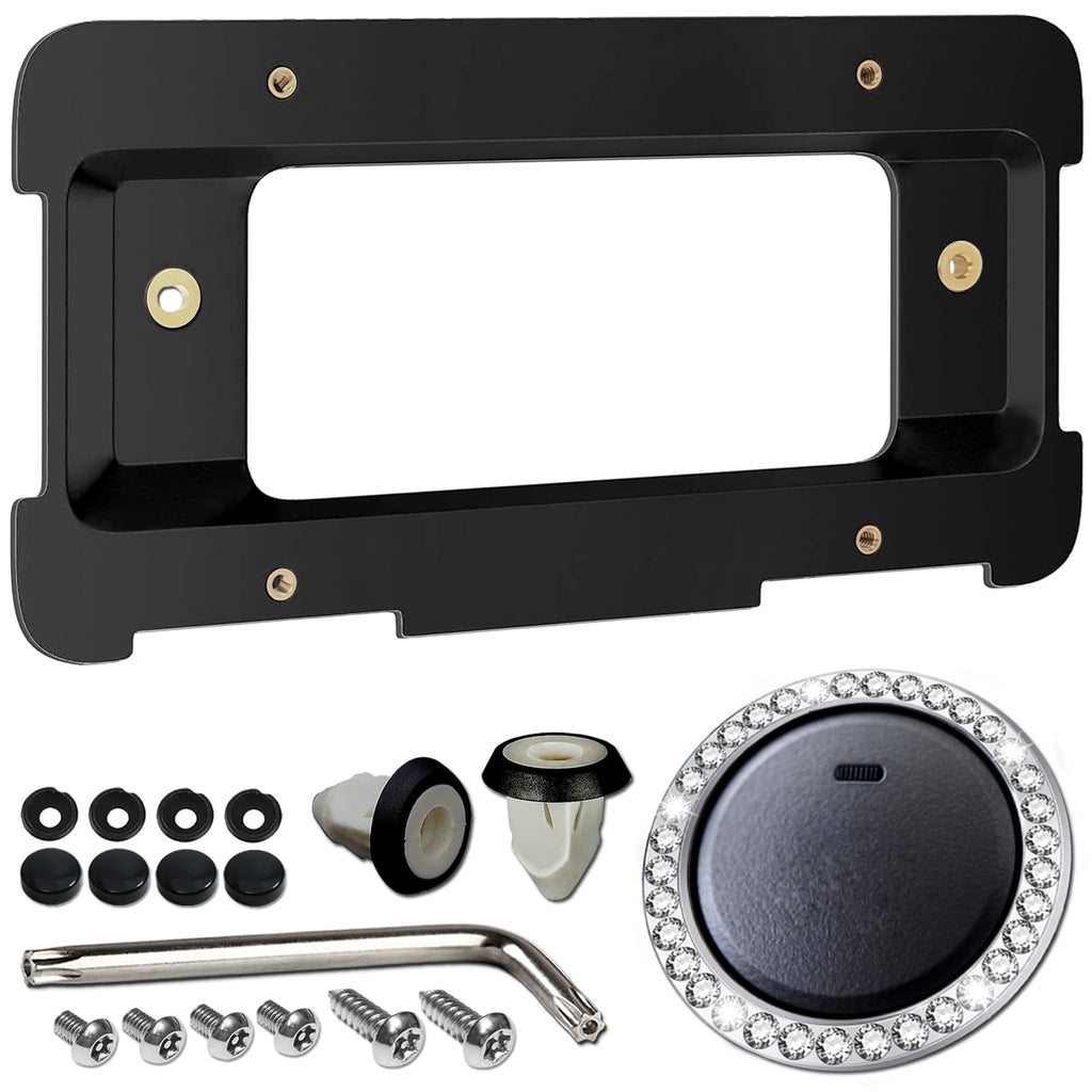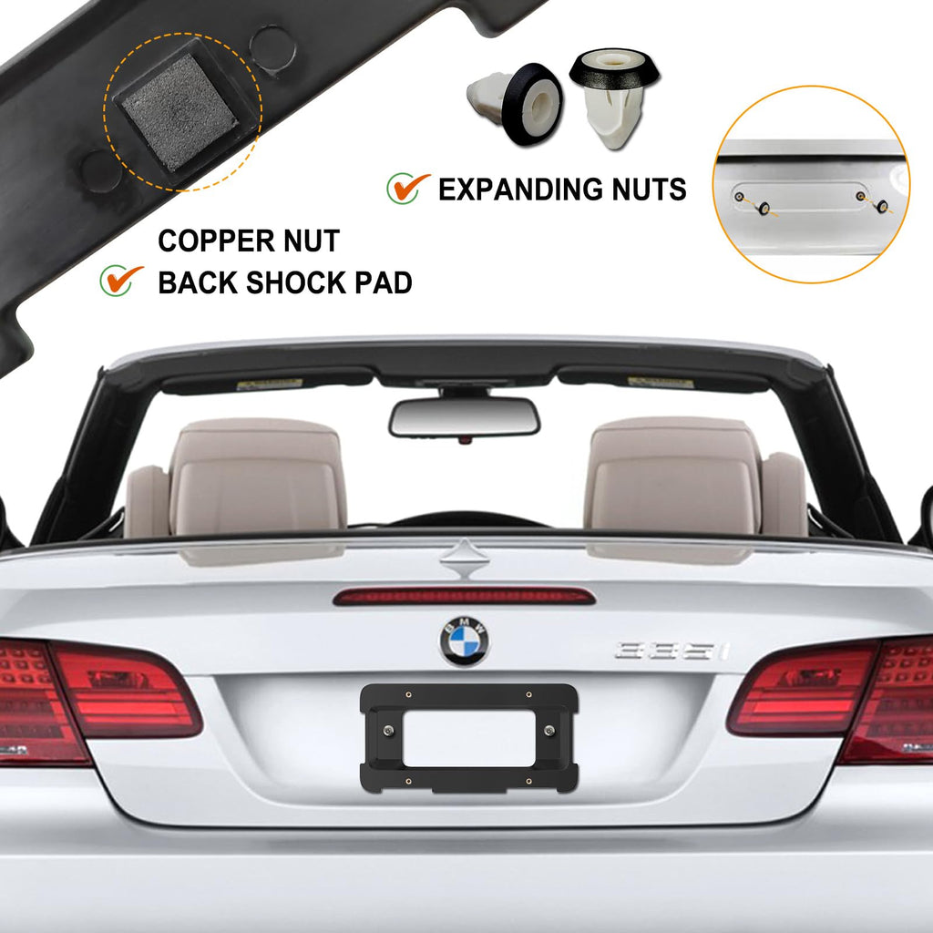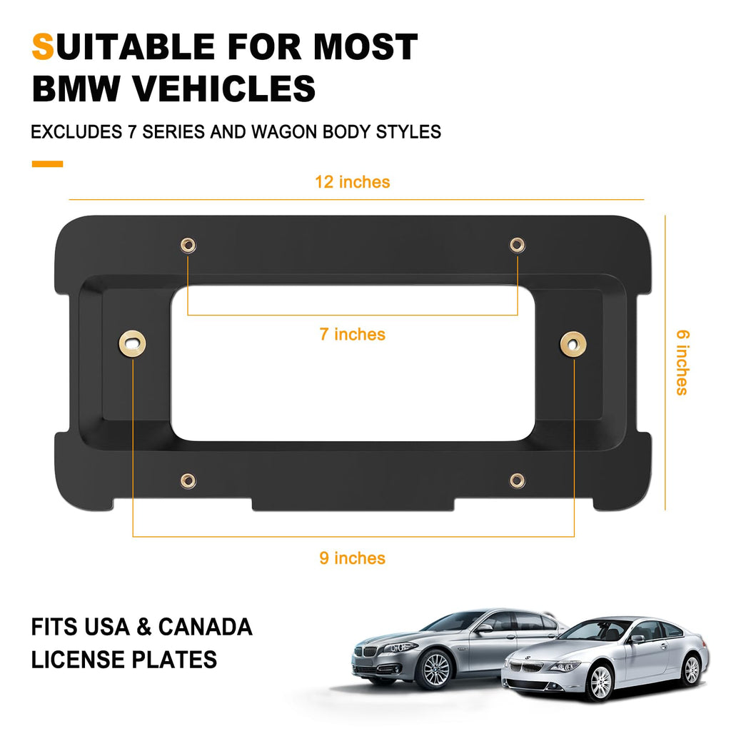 - Plastic License Plate Holder for BMW:Made with ABS material, Weather-Resistant. The black plastic BMW bracket has 2 brass mounting holes, one of which is oval, which means it allows for a slight adjustment if the holes on the bumper are not at the exact position. 4 brass rust- proof golden nuts are injection-molded, with metal threads to fasten the screws bolts.